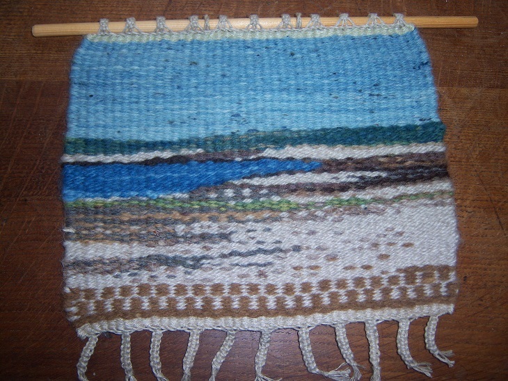 This picture has been woven using wool weft on a warp spaced at four threads an inch. It is more like traditional tapestry weaving. However, basing pictures on seascapes without steep slopes makes it quicker to weave on a loom. This picture is based on part of one of Sue Lewington's in the first edition of Scilly notes.