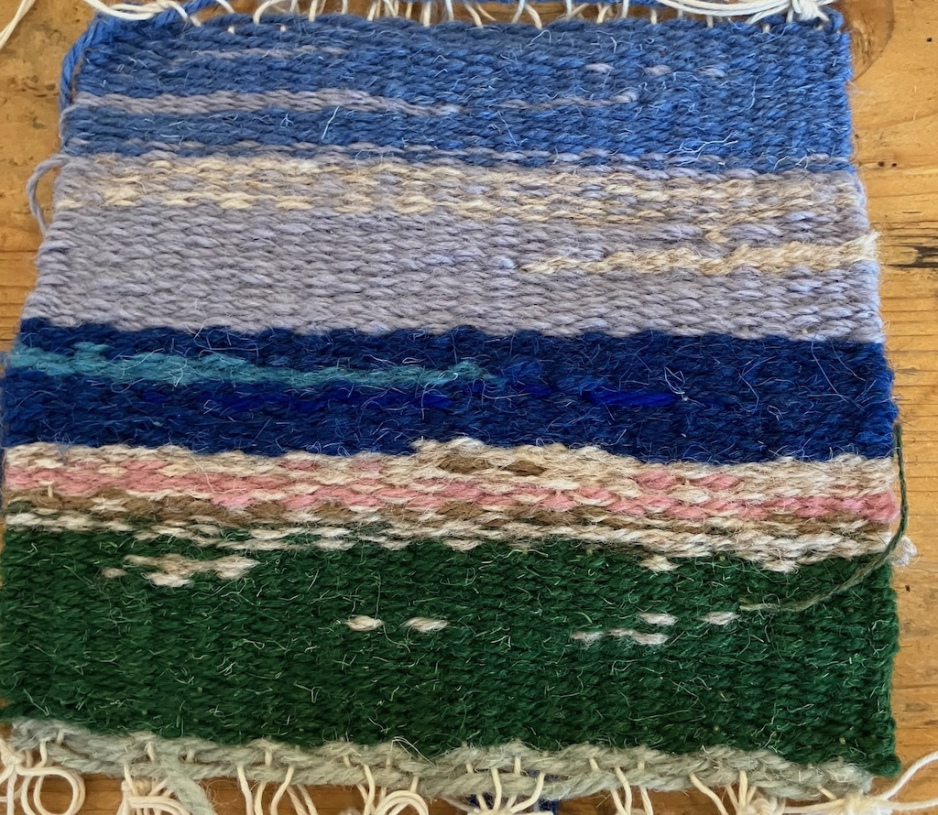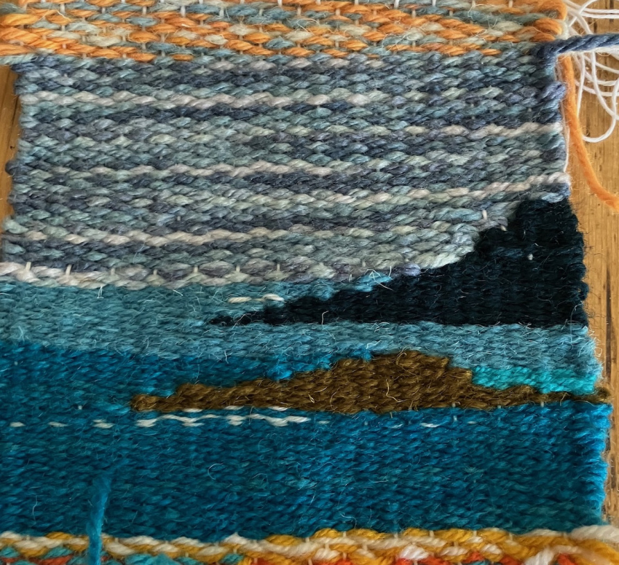 Weaving on a rigid heddle loom and choosing a landscape or seascape without steep slopes makes it possible to complete a picture in a few hours whilst practicing techniques which can be used on a simple frame. See pictures for more information. The scenes below were woven by the participants in June at Coleshill. I will be running the course again on 17th May 2026