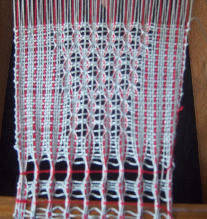 The warp can also be maniupulated by wrapping the weft round a group of threads (known as Brookes Bouquet - see top of sample). Alternatively, you can twist the warp (Leno - bottom of sample)