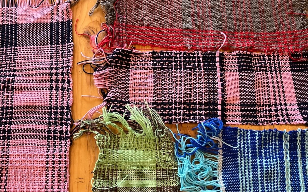 Students weave patterns using two colours on a loom set up for balanced weave and on one set up weft faced weave. They swap looms at lunch time.