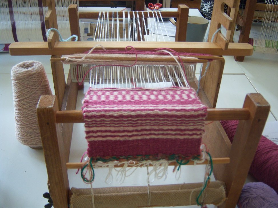 Students weave patterns using two colours on a loom set up for balanced weave and on one set up weft faced weave. They swap looms at lunch time.