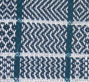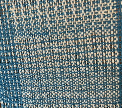 For balanced weave, the warp is closer together and the spacing is the same as the weft. The warp shows and contributes to the design. The colours of the warp and weft form the patterns in the blue and turquoise sample.