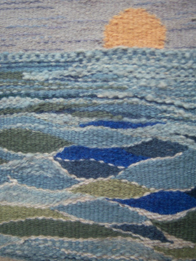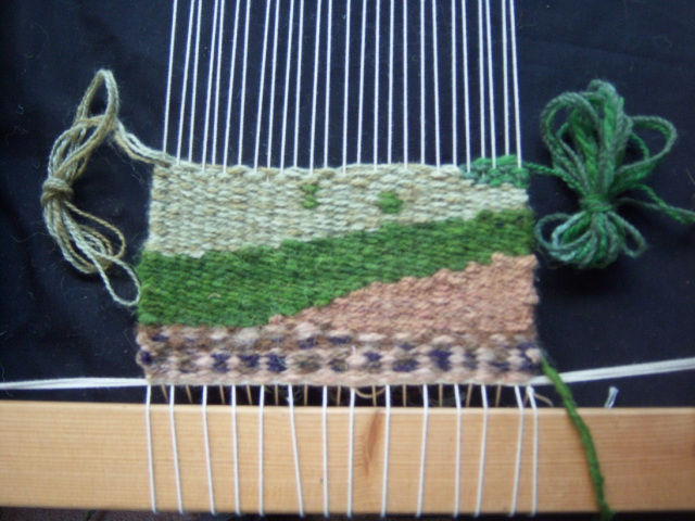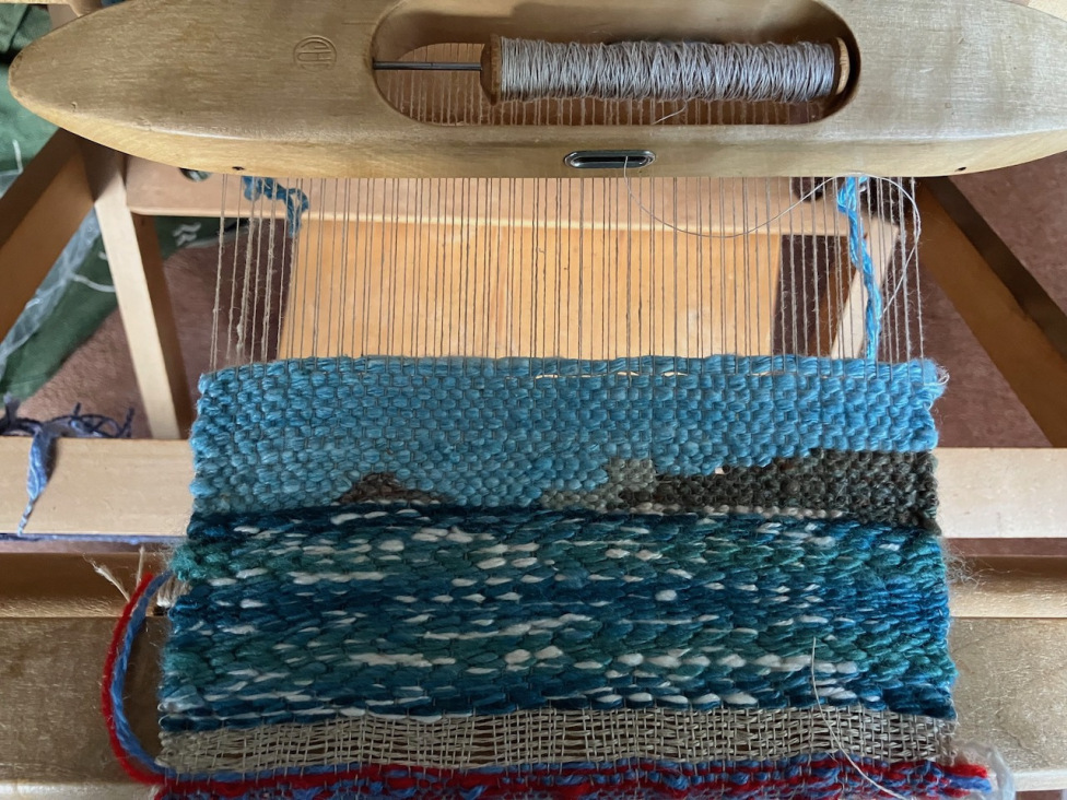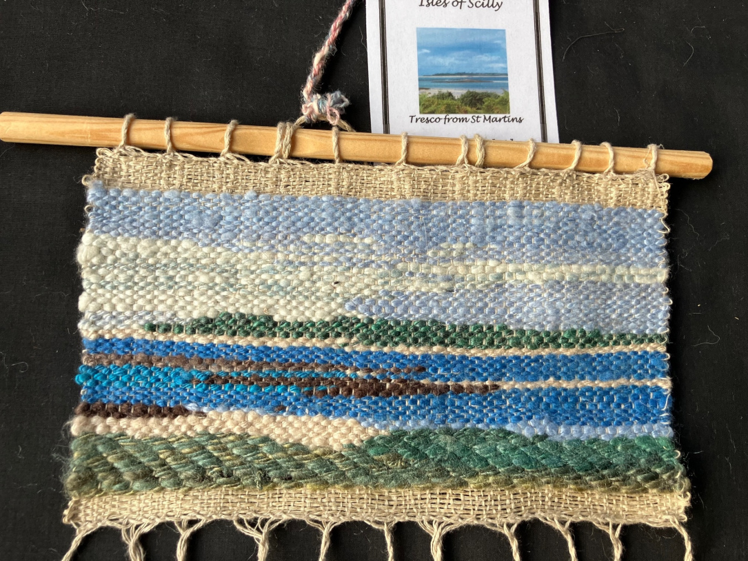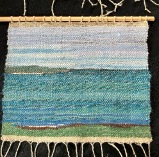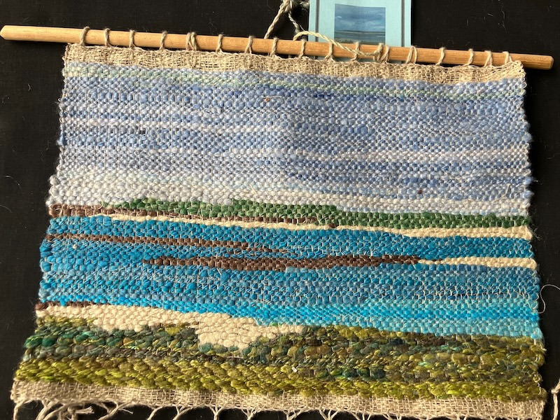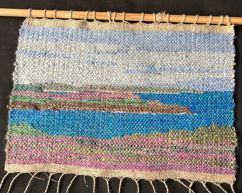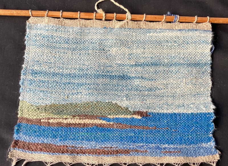 I returned to weaving pictures when I was taught the inlay technique. I also started weaving bigger pictures on my loom using the weft faced technique which is used for tapestry. I think of this as “lazy tapestry weaving”! Landscapes and seascapes which do not have steep slopes are best. A significant amount of the picture is woven with one shuttle for each row. I often use several strands of wool of varying hues to produce colour variations. I also use wool which has been dip dyed. I use meet and separate, a traditional tapestry technique using two or more shuttles, when slopes are needed.