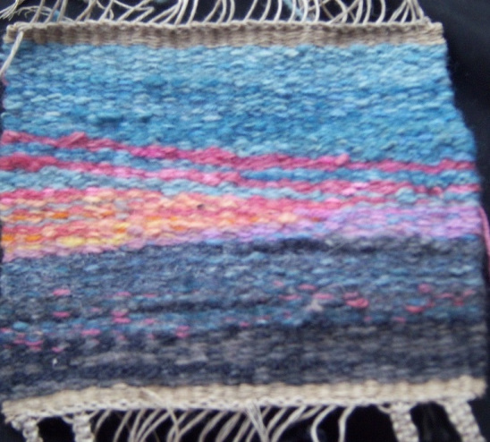This picture is based on a sunset from ScillyWebcam. I have used a mixture of yarns. The sky is woven from yarn I had dyed with indigo.