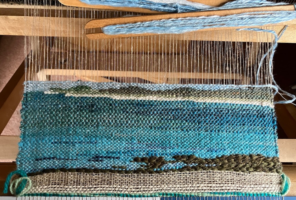 I enjoy weaving pictures based on seascapes (mostly the Isles of Scilly) and landscapes. This picture was woven with hand-spun silk weft on a fine linen warp. I have sold a number of this type at North Farm Gallery on St Martins. Unfortunately it closed in 2024. I have listed a few of them with prices on the Pictures page